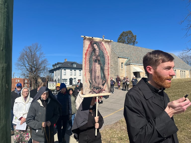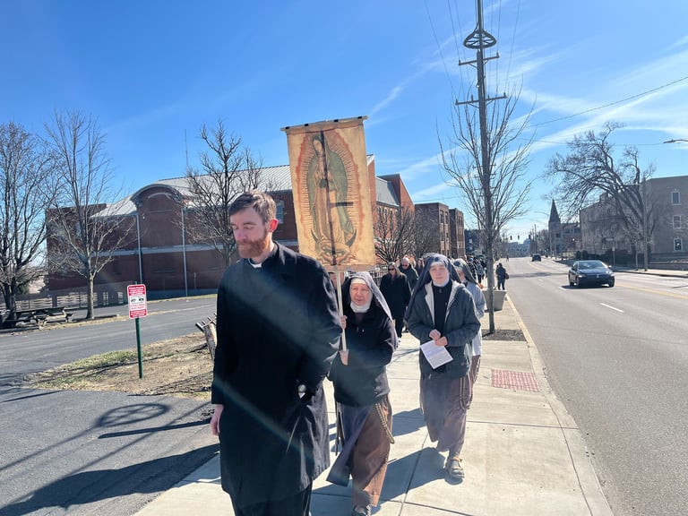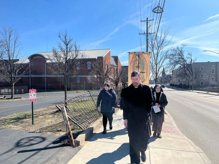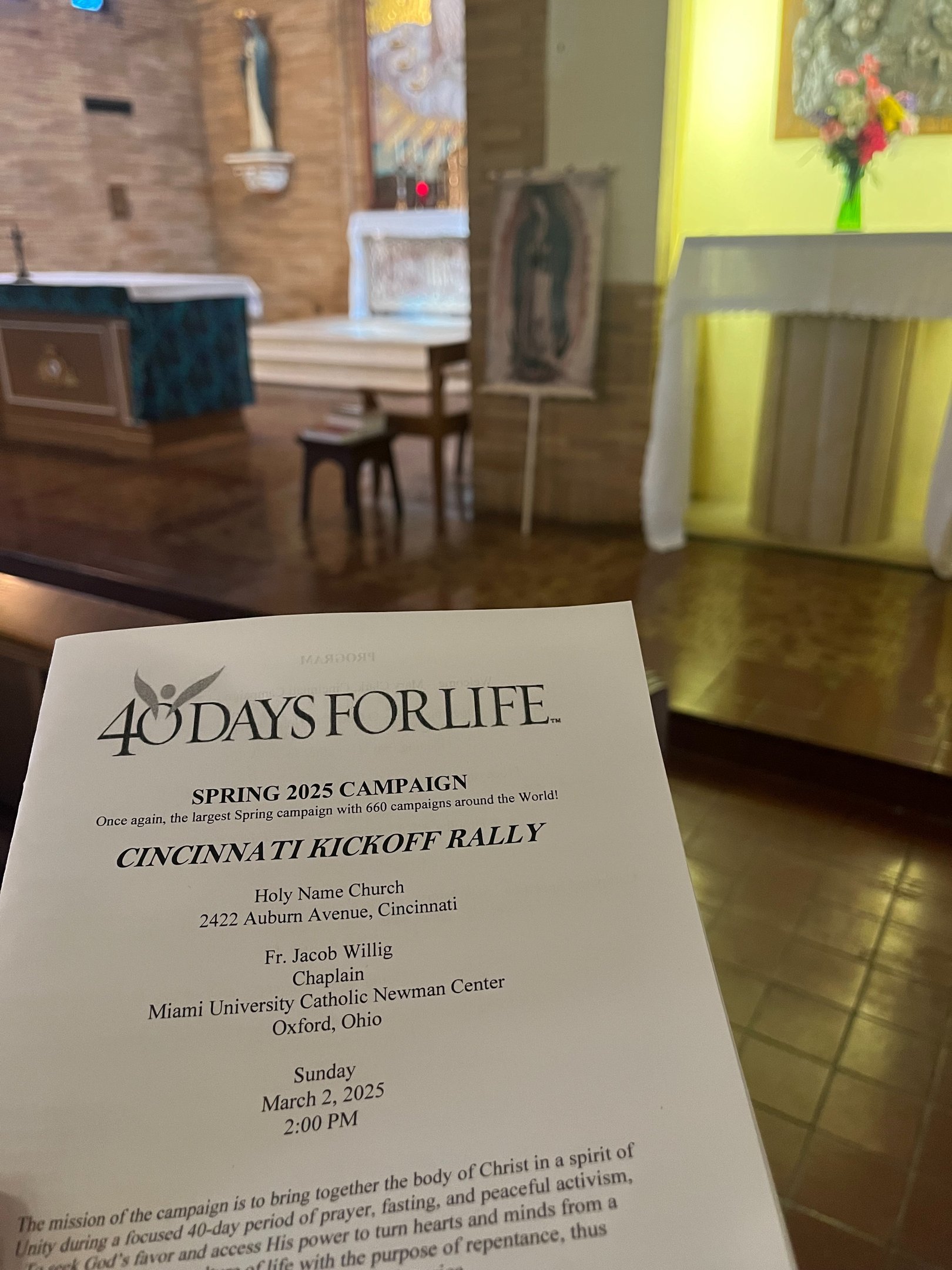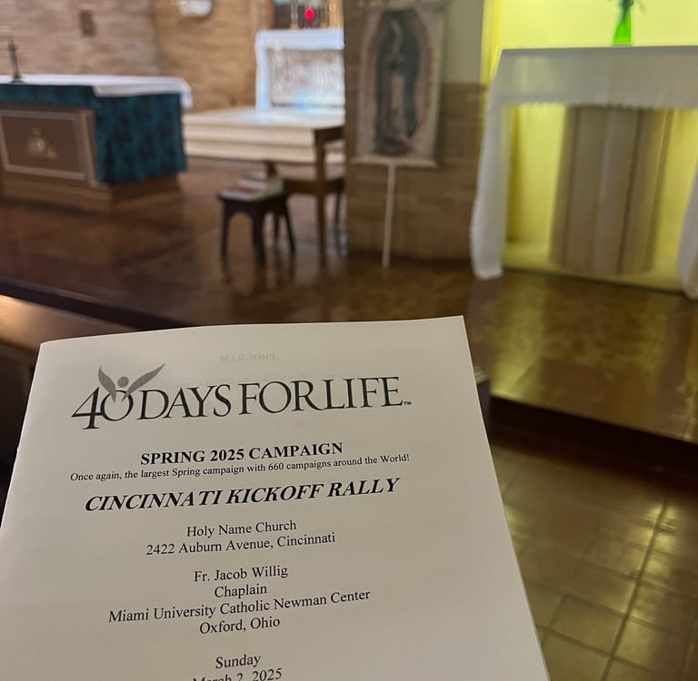 This Past Sunday, Holy Name church hosted the kick-off ceremony for the Spring campaign of 40 days for Life. 40 days for Life is an organization that promote prayer, fasting and community outreach for the end of abortion. During each "campaign", someone is present to peacefully pray outside the abortion facility 24 hours a day for 40 days. The Cincinnati 40 days for life group runs 2 campaigns each year, and is launching a "40 days 365" campaign this summer. Being just a few blocks from the local planned parenthood, Holy Name church also provides parking for the pro-lifers year-round.